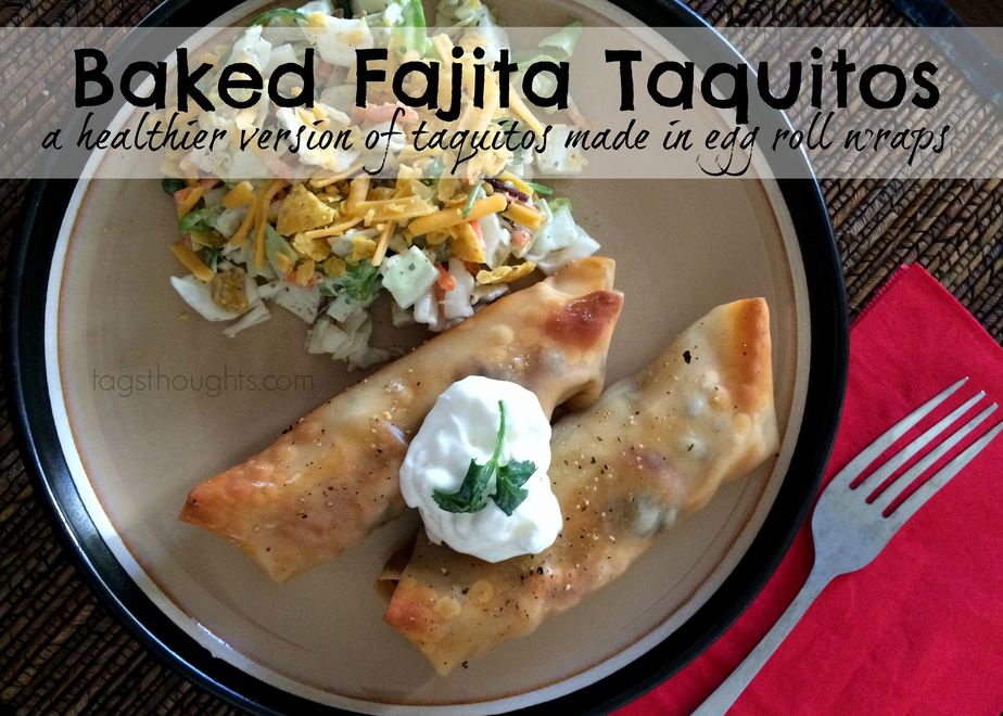 Baked Fajita Taquitos (in Egg Roll Wraps) by trishsutton.com Baked Fajita Taquitos are a healthier version of Taquitos. They are wrapped in Egg Roll Wraps and are baked rather than fried. A simple Mexican recipe.